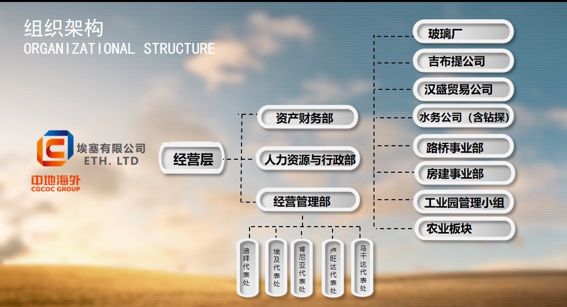 一、公司简介 中地海外埃塞公司是中地海外集团有限公司全资子公司,成立于2003年,具备一级工程总承包资质。在埃业务覆盖钻探地勘、城市供水、公路桥梁、电力、房建、工业投资、贸易物流、房地产及农业开发等9大板块。 截至2020年底,公路板块累计施工里程超过1700公里;钻探板块市场占有率高达63%,累计进尺深超过15万米;供水板块为首都亚的斯亚贝巴提供了80%以上的清洁用水;房建板块承建了多个大型政府企业总部、会展中心项目。