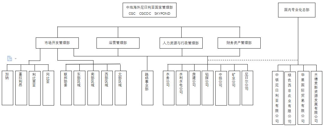 中地海外集团尼日利亚有限公司来源:中地海外集团 点击:41次 一、公司简介 中地海外尼日利亚有限公司是中地海外集团的全资子公司,作为一家长期扎根海外的知名企业,自1982年以援外的方式进入尼日利亚以来,经过近40年的开拓进取,业务领域已从最初的单一打井工程,拓展至目前的公路、桥梁、房建、供水、大坝、灌溉、机场、贸易等多个领域。 目前,中地海外尼日利亚有限公司已有中方员工500余人、当地雇员5000余人。凭借灵活的体制机制和数十年长期扎根海外的人才团队优势,中地海外以优良的工程质量完成了阿布贾ONEX高等级公路、Dadinkowa水厂、Gombe州体育馆、非发行办公大楼、DUTSE机场等大型项目。截止目前,我们已完成路桥项目近500个,完工里程约4000KM,水厂类目100余个,管网铺设132.8万米,每天供水量达12.84亿升水;在水利灌溉方面,灌溉农田达23000公顷,在农业方面,已为尼日利亚提供了超过两万吨的优质种子,为尼日利亚稻谷增产的贡献超过100万吨,已成为尼日利亚最大的种子供应商之一。 中地海外长期致力于尼日利亚工程承包领域,现已跻身行业一流企业之列,所执行的项目得到尼中政府、业主、监理的一致好评。凭借着良好的形象和声誉,公司多次被选为尼日利亚中国总商会会长单位,在使馆和经商处的指导下,团结在尼中资企业,积极开展各项工作,维护在尼中资企业的整体利益和会员单位的合法权益,推动会员企业与尼政府和金融机构等的交流与合作,举办各类文体活动加强相互交流、促进企业精神文明建设,整体上为促进在尼中资企业团结、合作、规范、可持续发展做出了积极努力,取得了明显成效。 目前,中地海外尼日利亚有限公司依靠强大的品牌影响力和良好的企业信誉,自觉肩负“实现中国民族伟大复兴的中国梦”这一国家使命,服务于“一带一路”倡议的实施,努力为东道国经济发展提供“一站式”综合解决方案,并帮助其实现项目的实施及落地。 下一阶段,中地海外尼日利亚有限公司还将继续积极发担当中非合作合作论坛北京峰会提出的“八大行动”践行者的角色,发挥“非洲发展的伙伴,中非合作的桥梁”作用,承担建设好“中地海外综合服务平台”的任务,让更多企业和人才了解非洲、来到非洲、扎根非洲,增进中尼经济、贸易、文化合作,为两国人民促交流、增感情、造福祉。 二、公司领导 叶水金(中地海外集团副总裁、中地海外尼日利亚总经理、中共中地海外尼日利亚党总支书记) 樊孝静(中地海外尼日利亚副总经理、市场开发管理部总监) 杨建康(中地海外尼日利亚副总经理、运营管理部总监) 钟翔(中地海外尼日利亚副总经理、水务公司总经理) 李剑锋(中地海外尼日利亚总会计师) 汪筠(中地海外尼日利亚总经理助理、绿色农业西非有限公司总经理) 三、企业文化 核心理念:合作创造财富,创新引领发展 企业精神:心怀高原,脚踏实地 企业特质:中国式新型跨国公司 公司定位:非洲发展的伙伴,中非合作的桥梁 品牌释义: 公司标识使用两种颜色:橙黄色和蓝色,以橙黄色为主,标识中右上半角蓝色代表“梦想的天空”,左下半角橙黄色代表“收获的大地”,黄色的“C”代表黄皮肤的中国人,同时也是英文China及Construction的首字母。“天与地”和谐交融,预示着我们用开放、专注、专业的态度,聚集广阔的海外市场,脚踏实地、奋力拼搏,最终实现心中的梦想。 四:组织机构: