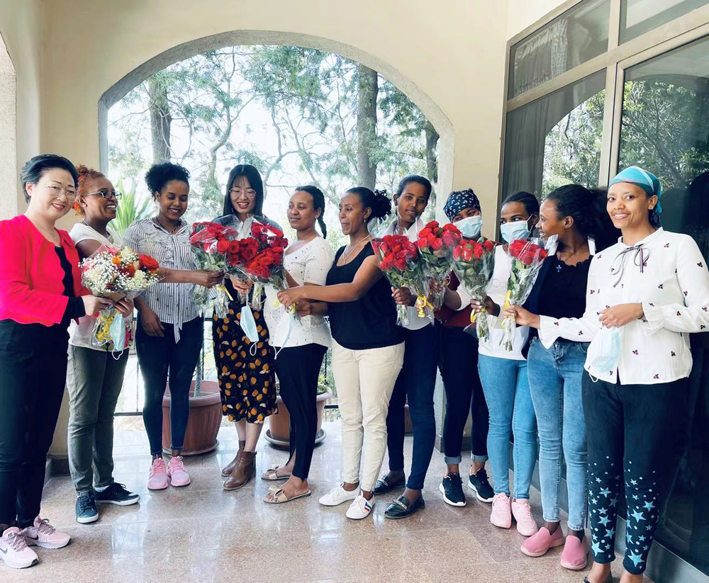 埃塞国管部庆祝国际妇女节来源:中地海外集团 点击:4次 2021年3月8日,中地海外集团埃塞国管部为女性员工送上节日鲜花庆祝国际三八妇女节。 中地海外埃塞国家管理部约有200余名埃塞籍女性员工。她们在各个项目从事工程、会计、电工、厨师、建筑施工、后勤及安保等工作。 埃塞女性因容貌靓丽,素有非洲“黑珍珠”之称,其首都亚的斯亚贝巴意即为“鲜花之城”。中地海外集团在埃塞扎根多年,一直积极为埃塞当地女性提供就业岗位,促进当地性别公平,保障女性员工的合法权益和个人福祉,致力于提供发展和自我实现的舞台,让每一位女性员工像埃塞的鲜花一样美丽绽放。