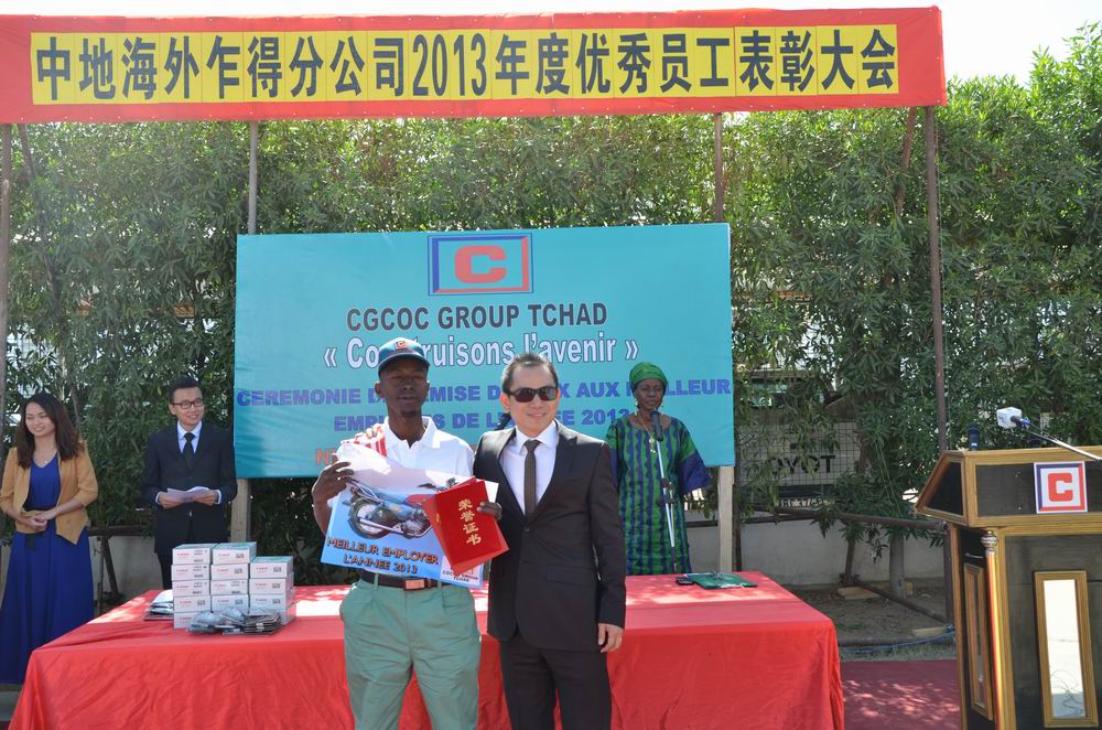 乍得分公司举行2013年优秀员工表彰大会来源:中地海外集团 点击:24次 2013年12月14日,中地海外乍得公司举行了2013年优秀员工表彰大会。表彰大会以“共建乍得美好明天”为主题,以表彰优秀员工、学习先进事迹、促进公司和当地经济发展为宗旨,共表彰33名乍方优秀员工,17名中方优秀员工。中方优秀员工代表骆斌,乍方优秀员工代表APOBA TAO FERDINAND分别发表获奖感言,感谢公司给予的肯定和奖励。会后,乍得总经理庞冬松和人事部经理NONDOGOMGAR APOLINE接受了乍得国家电视台、国家广播电台采访,介绍了中地海外乍得公司的情况。乍得公司近几年每年举行一次优秀员工评选,被当地员工亲切地称为“中地海外节”(FêTE DE CGCOC)。