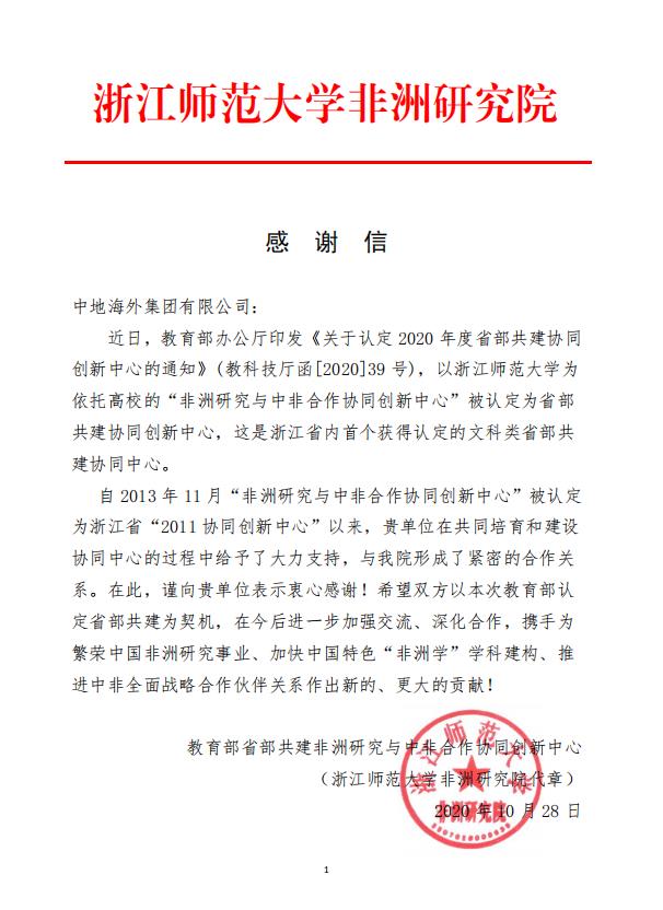 非洲研究与中非合作协同创新中心被教育部认定为省部共建协同创新中心来源:中地海外集团 点击:236次 近日,由浙江师范大学牵头,中国石化新星石油公司所属中地海外公司参与申报的“非洲研究与中非合作协同创新中心”被教育部认定为省部共建协同创新中心,该中心是浙江省首个获得认定的文科类省部共建协同创新中心。 下一步我司将依托这个中心,继续与浙江师范大学非洲研究院以及参与各方保持和深化合作关系,进一步拓展合作领域、创新合作方式、提升合作水平,力争创造更多合作成果,为我国非洲研究与中非合作事业发展作出新的贡献。