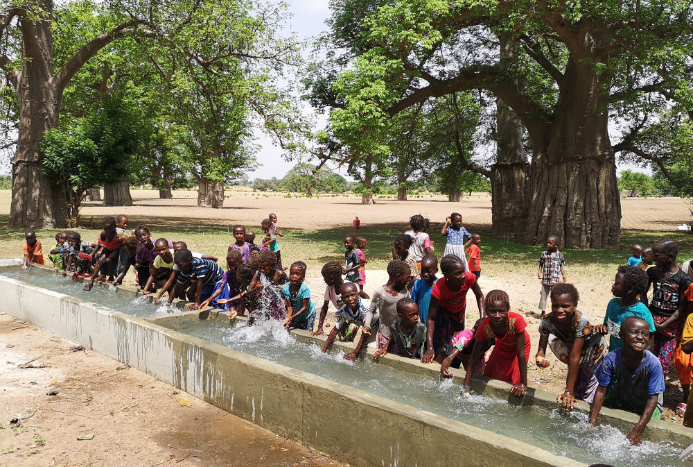 2019年7月15日,在塞内加尔中部坦巴昆达大区一处村庄,当地村庄的儿童在刚刚建好并灌满干净井水的牲畜饮水槽戏水。 塞内加尔总统萨勒表示,乡村打井项目将彻底解决塞内陆偏远地区用水难问题,为促进塞经济社会全面发展发挥重要作用。塞方感谢中方想塞方之所想、急塞方之所急。