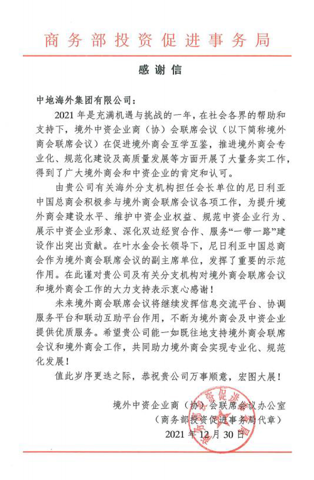 集团公司收到境外中资商会感谢信来源:中地海外集团 点击:0次 2021年12月30日,公司收到境外中资企业商(协)会联席会议办公室的感谢信。信中指出,中地海外尼日利亚公司作为尼日利亚中国总商会会长单位,积极参与境外商会联席会议各项工作,为提升境外商会建设水平、维护中资企业权益、规范中资企业行为、展示中资企业形象、深化双边经贸合作、服务“一带一路”建设作出了突出贡献,受到了来自境外中资企业商(协)会的一致认可和高度评价,并对我司致以感谢。 未来,公司将一如既往地支持境外商会联席会议和境外商会相关工作,为助力实现境外商会专业化、规范化发展做出积极的贡献。