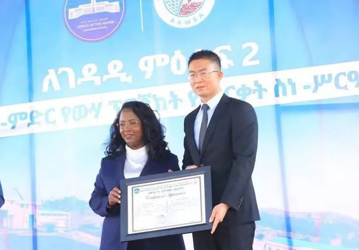 亚的斯市市长Adanech Abiebie女士为中地海外埃塞国管部副总经理孙见琼颁发感谢证书 Legedadi供水项目(二期)工程包括建设10座水池、116.6公里的管道安装、16口潜水泵安装、2个泵站的地表泵及SCADA系统等内容。项目建成后,日供水量8.6万方,将大幅增加首都东部蓄水能力,改善当地供水现状,造福周边70万居民。