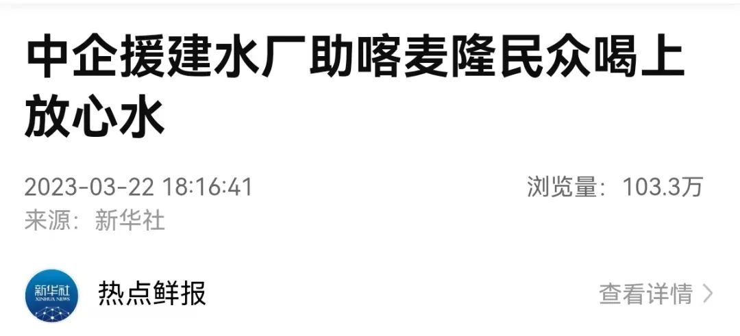 新华社刊登专题文章:中企援建水厂助喀麦隆民众喝上放心水来源:中地海外集团 点击:36次 喀麦隆九城市供水项目 2023年3月22日,新华社刊登专题文章《中企援建水厂助喀麦隆民众喝上放心水》。