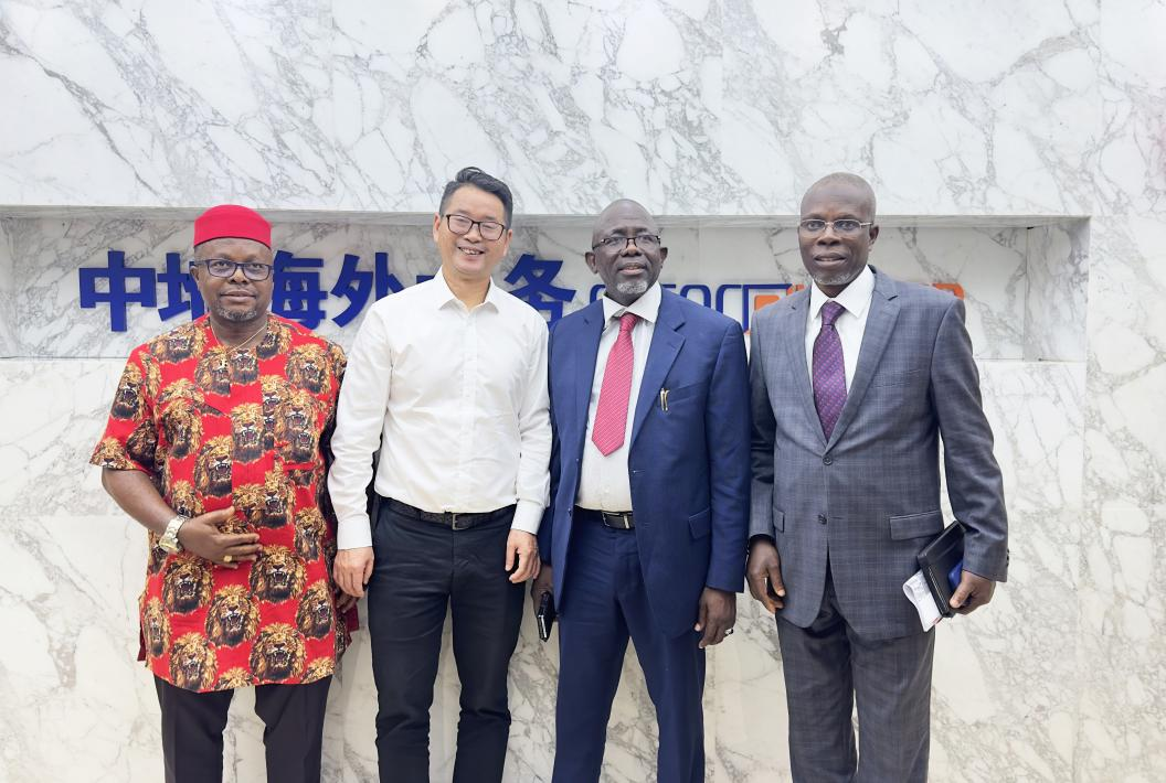 杜丰山总经理(左二)与尼首都开发委员会执行秘书SHEHU HADI AHMAD(右二),工程局长FERDINAND OBIORA EZEOHA(左一),水局总经理TAUHEED ABAYOMI AMUSAN(右一)合影留念。