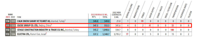 2023年度《美国工程新闻纪录(ENR)》全球最大250家国际承包商榜单节选