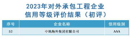中地海外 | 公司连续16年被评为信用等级AAA级企业来源:中地海外集团 点击:3次 根据《中国对外承包工程商会企业信用等级评价管理办法》,经过专业机构评价、评审委员会审议、网上公示等程序,中地海外公司获评“2023年度对外承包工程信用等级AAA级企业”(最高级),这是公司连续第16年获此殊荣。